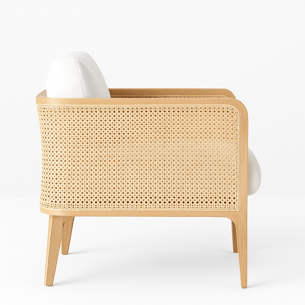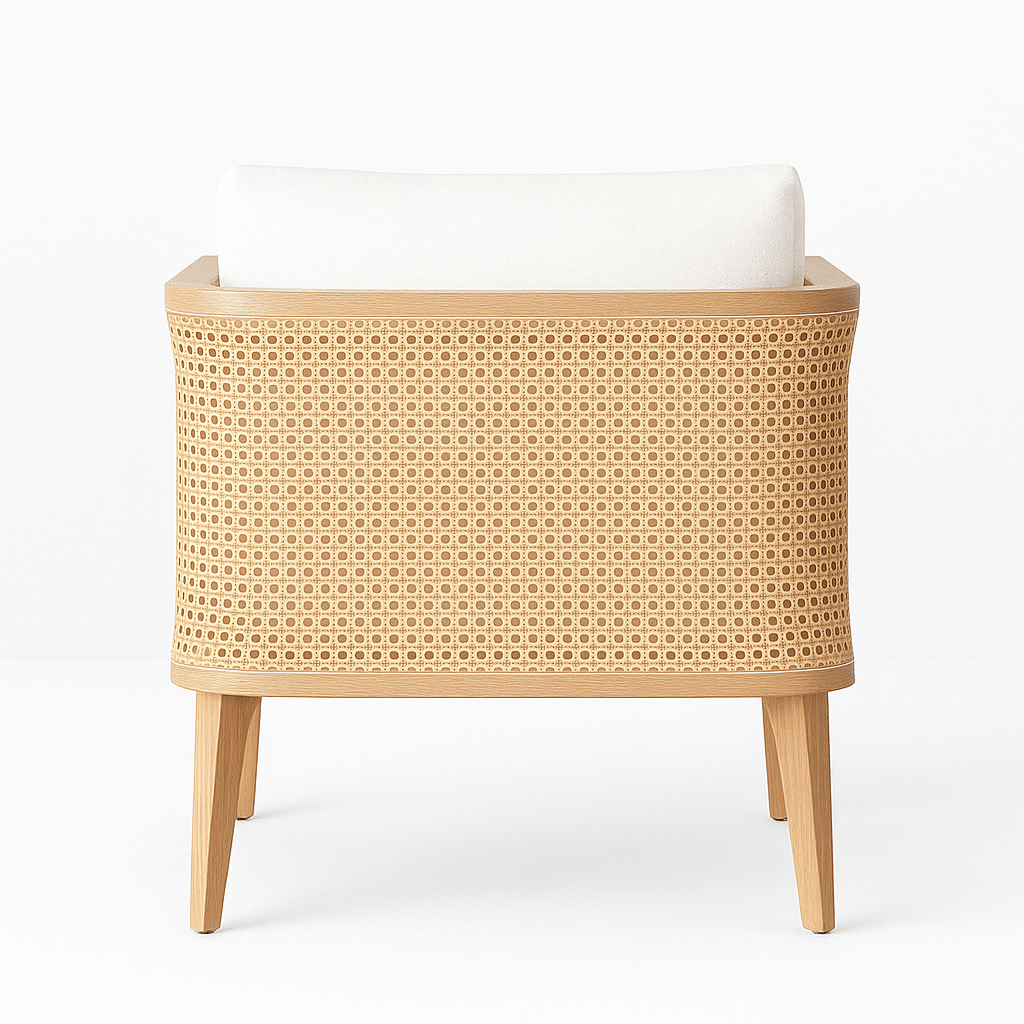 The woven natural cane detailing adds texture, breathability, and artisanal character. Inspired by classic craftsmanship yet styled with contemporary lines, the cane brings lightness and elegance to the structure — creating a chair that feels both grounded and airy.