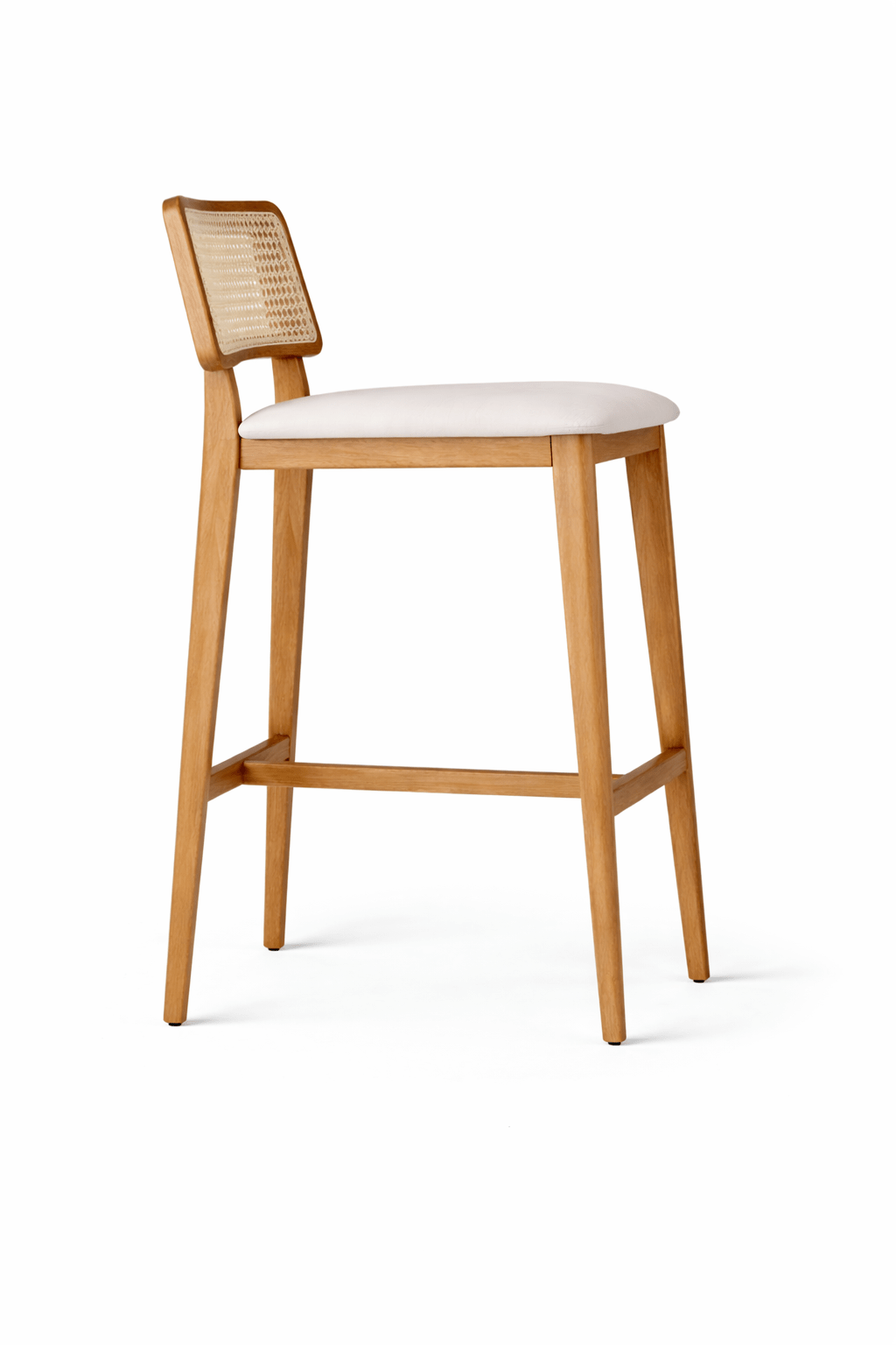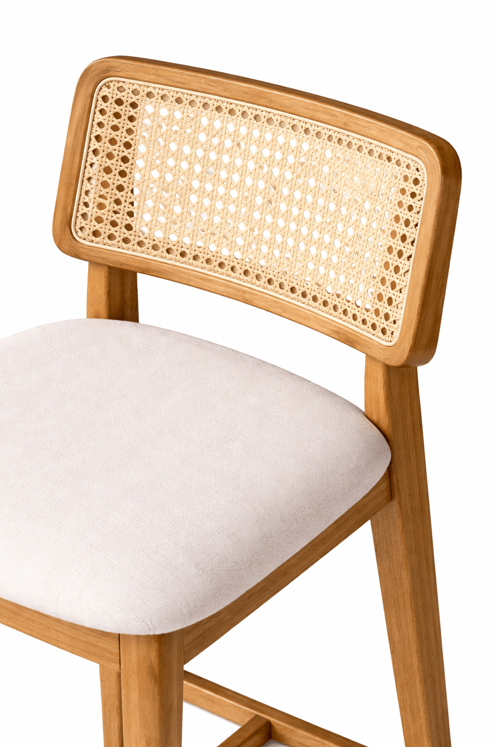 The woven cane backrests are not only visually distinctive but also functional, allowing breathability and ergonomic support. Paired with well-cushioned upholstered seats, these bar chairs are designed for extended comfort, making them ideal for kitchen counters, bar areas, and hospitality spaces. The proportions are carefully considered to provide the right seating height and posture, ensuring both comfort and ease of use.