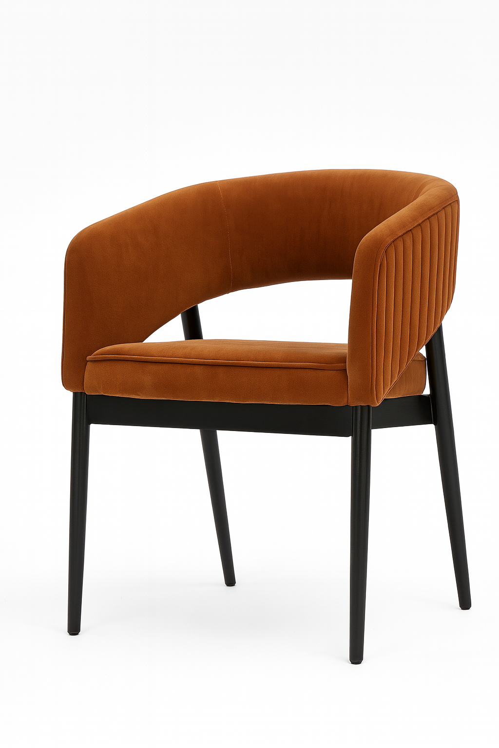 Comfort is a defining feature throughout the collection. The seats and backs are layered with high-density PU foam cushioning, providing supportive comfort suitable for extended dining use. Upholstery is carefully tailored to highlight each design—whether through seamless fabric application, soft rounded edges, vertical channel details, or sculpted wrap-around forms. The result is a seating collection that feels visually soft while offering practical comfort.