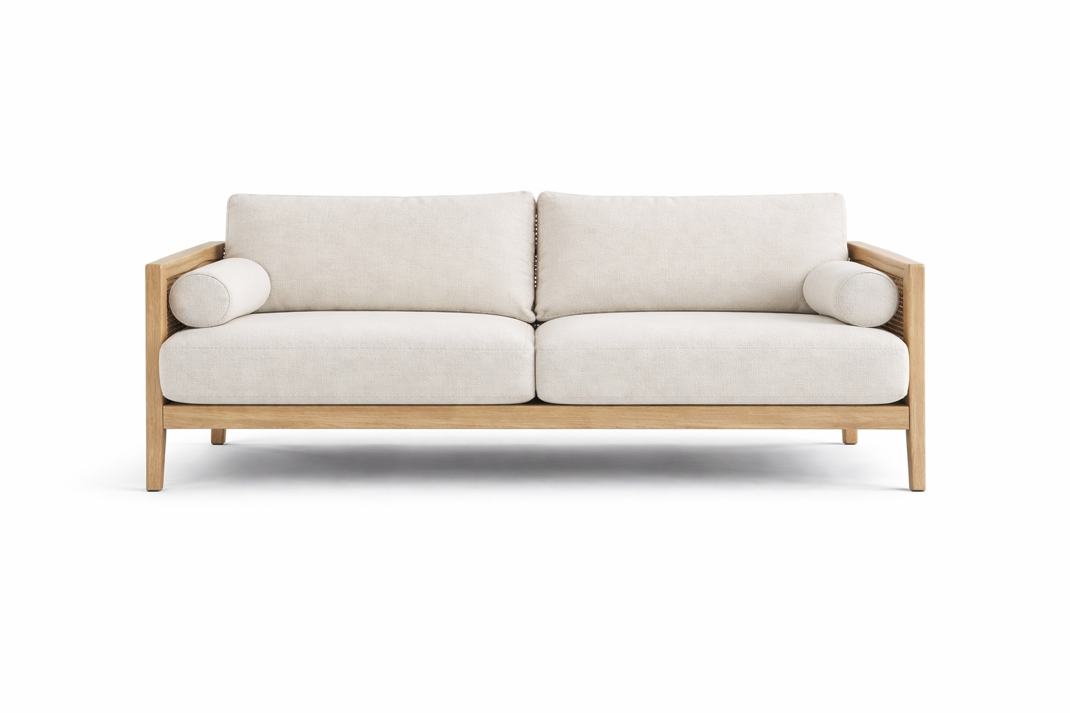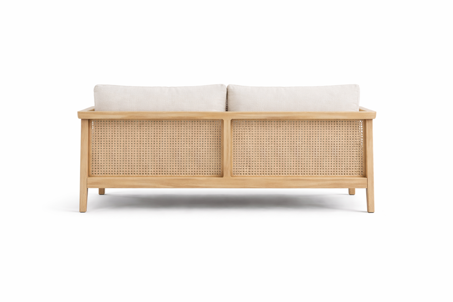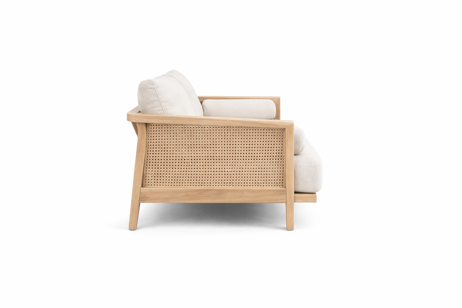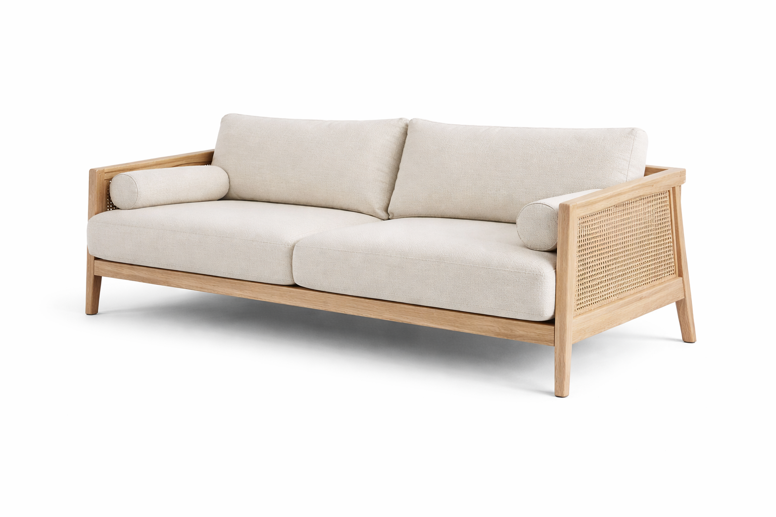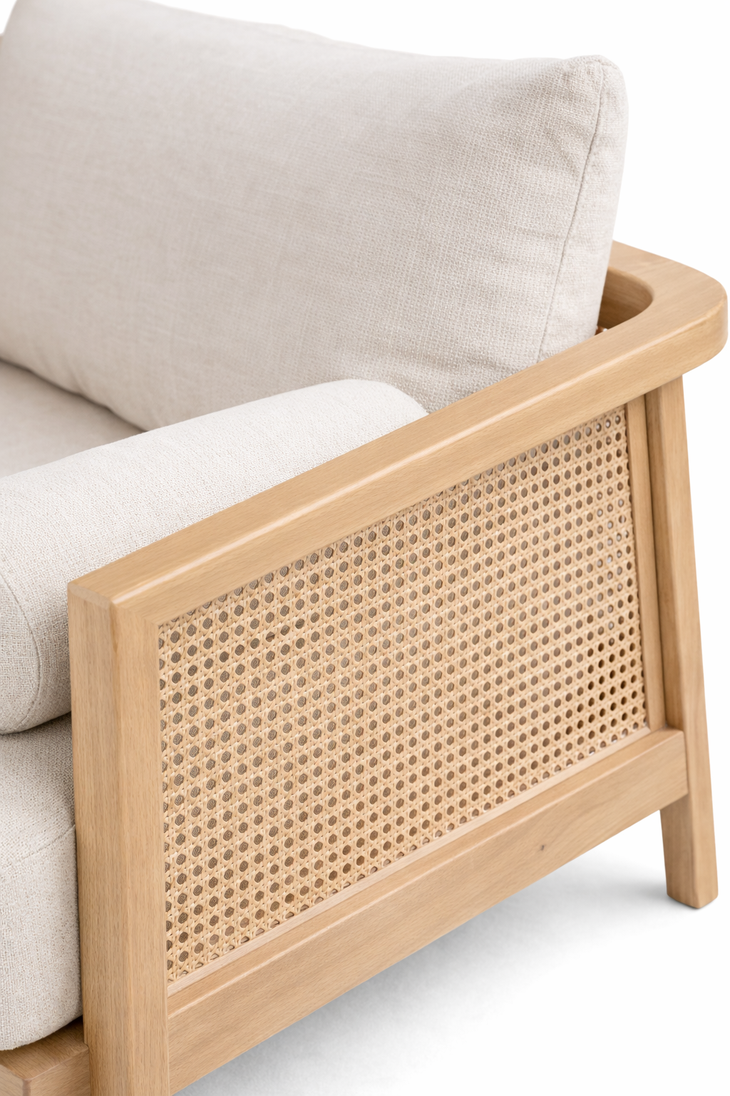 The woven cane panels introduce both elegance and craftsmanship, adding breathable texture and visual lightness to the sofas. Whether used on side frames, back panels, or arm sections, the cane detailing enhances the overall sophistication of the collection while reflecting traditional handwoven techniques adapted into contemporary forms.