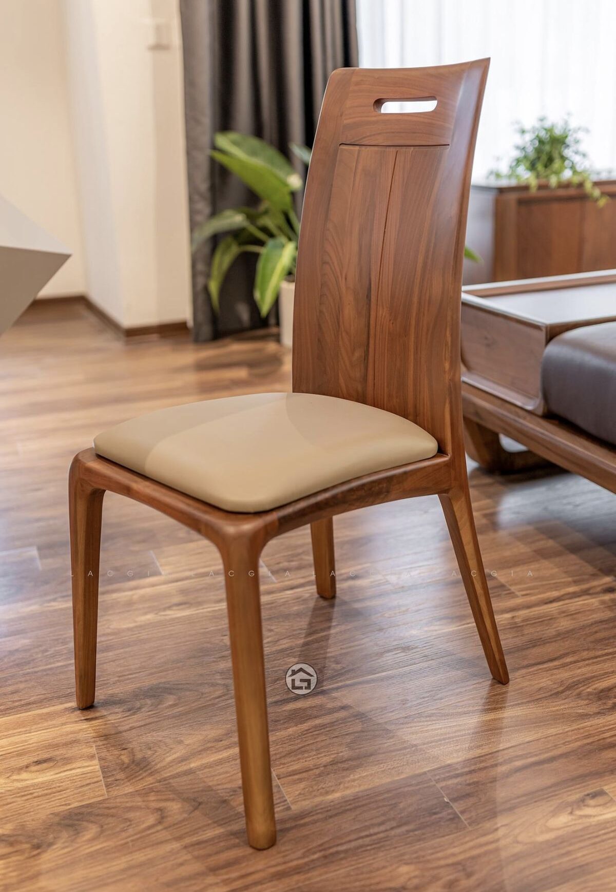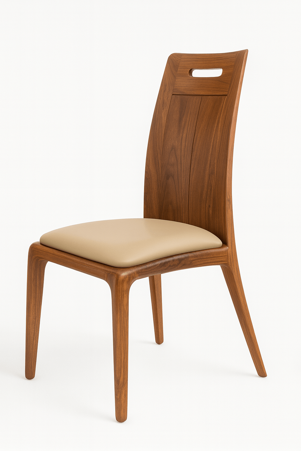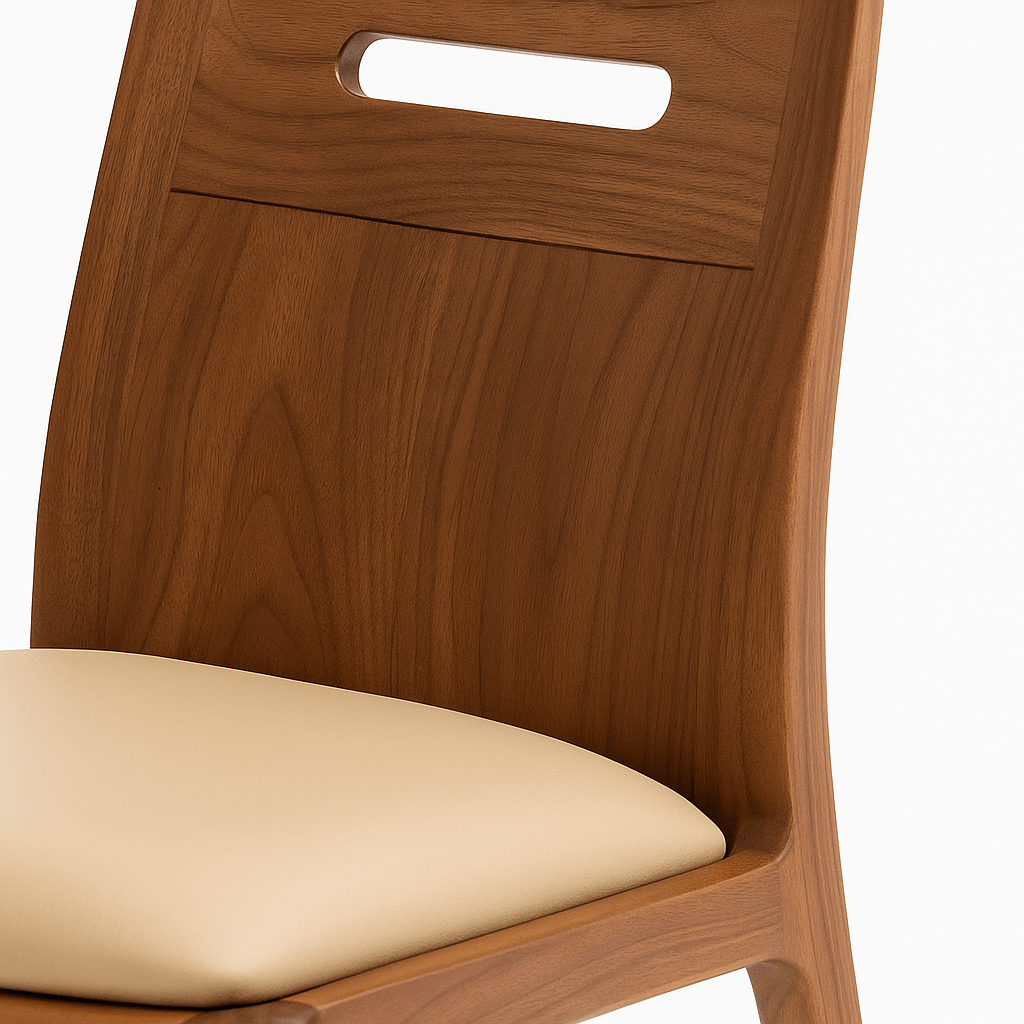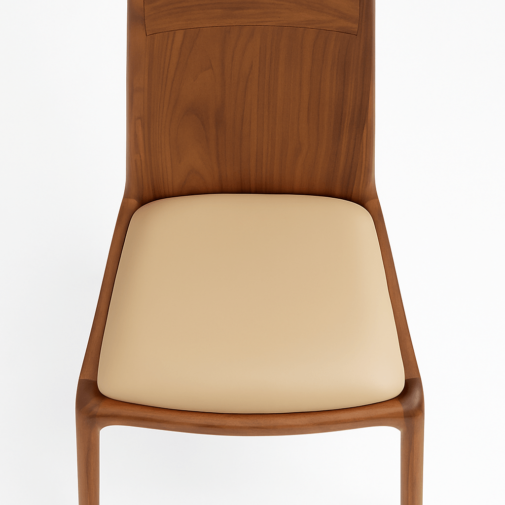 For seating comfort, the collection incorporates PU foam cushioning at the seat, finished with upholstery to provide softness and support while maintaining the clean visual balance between wood and fabric or leather-like surfaces. The upholstered seat enhances everyday usability without distracting from the natural wood presence that defines the category.