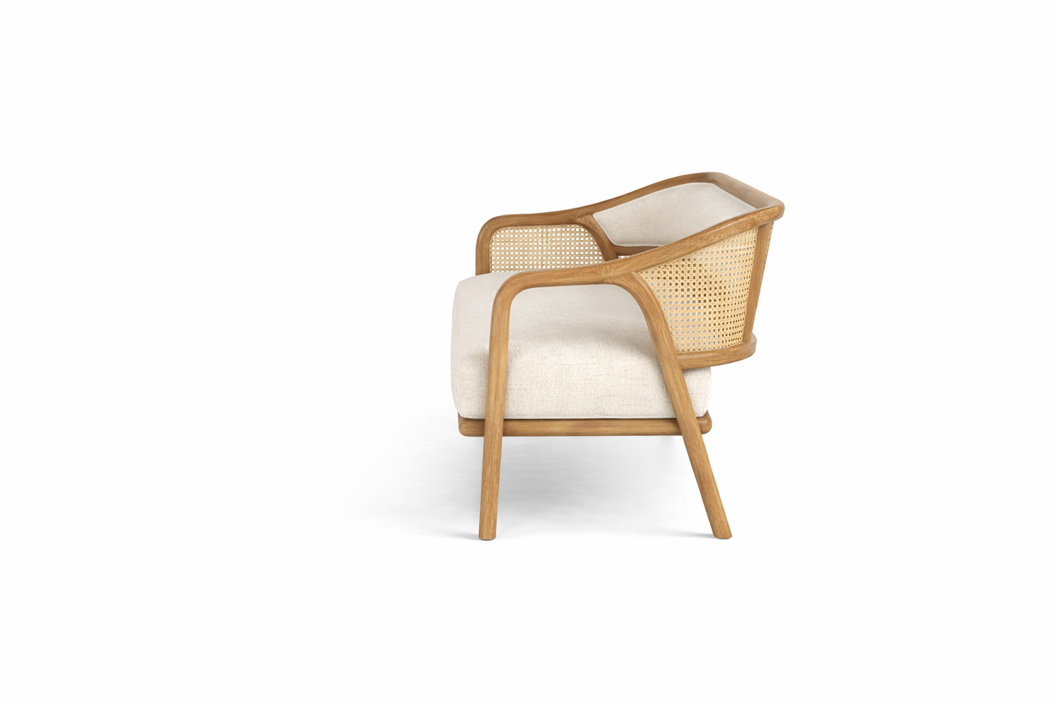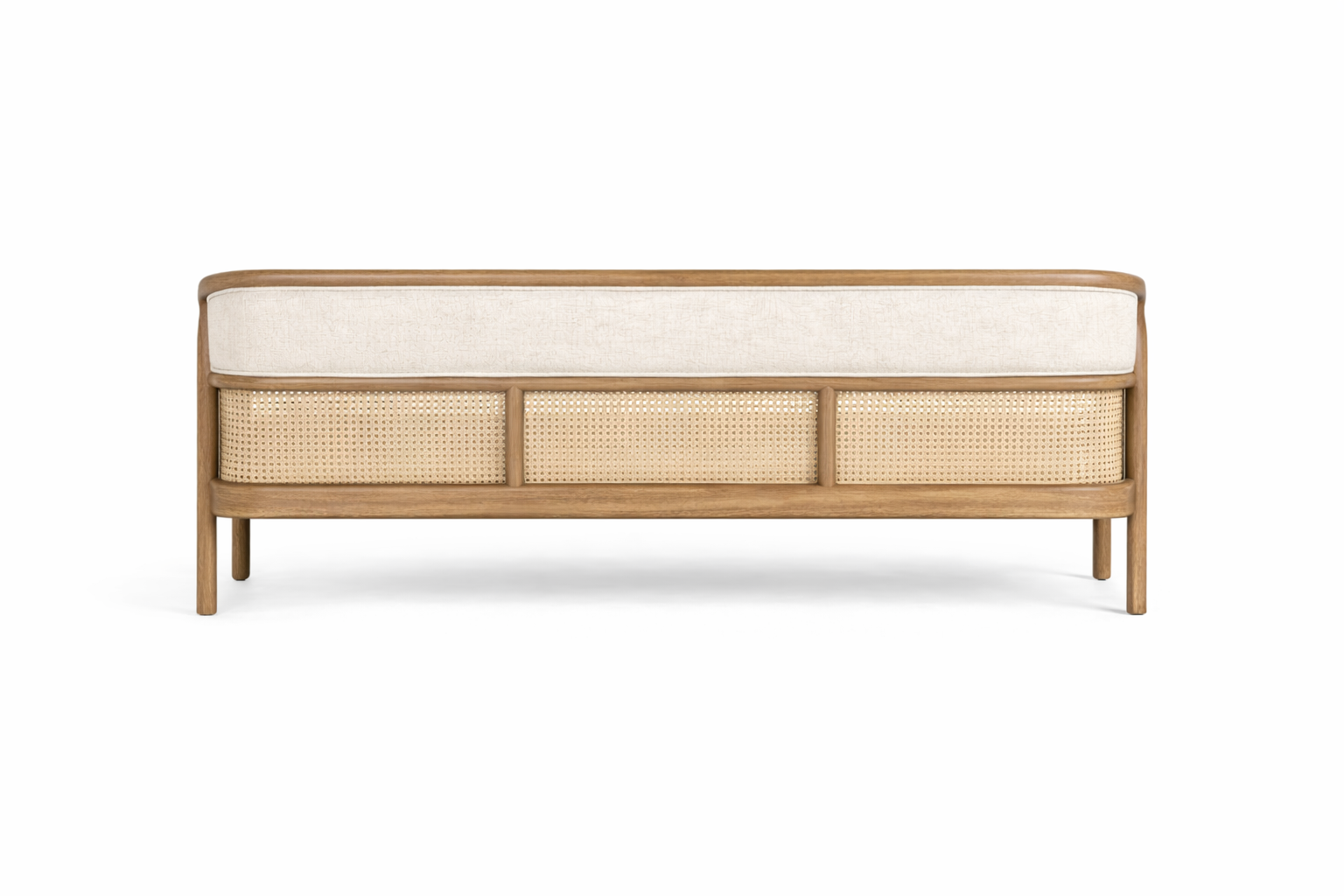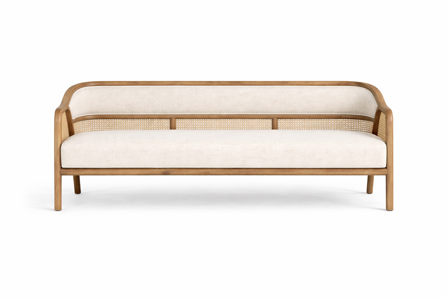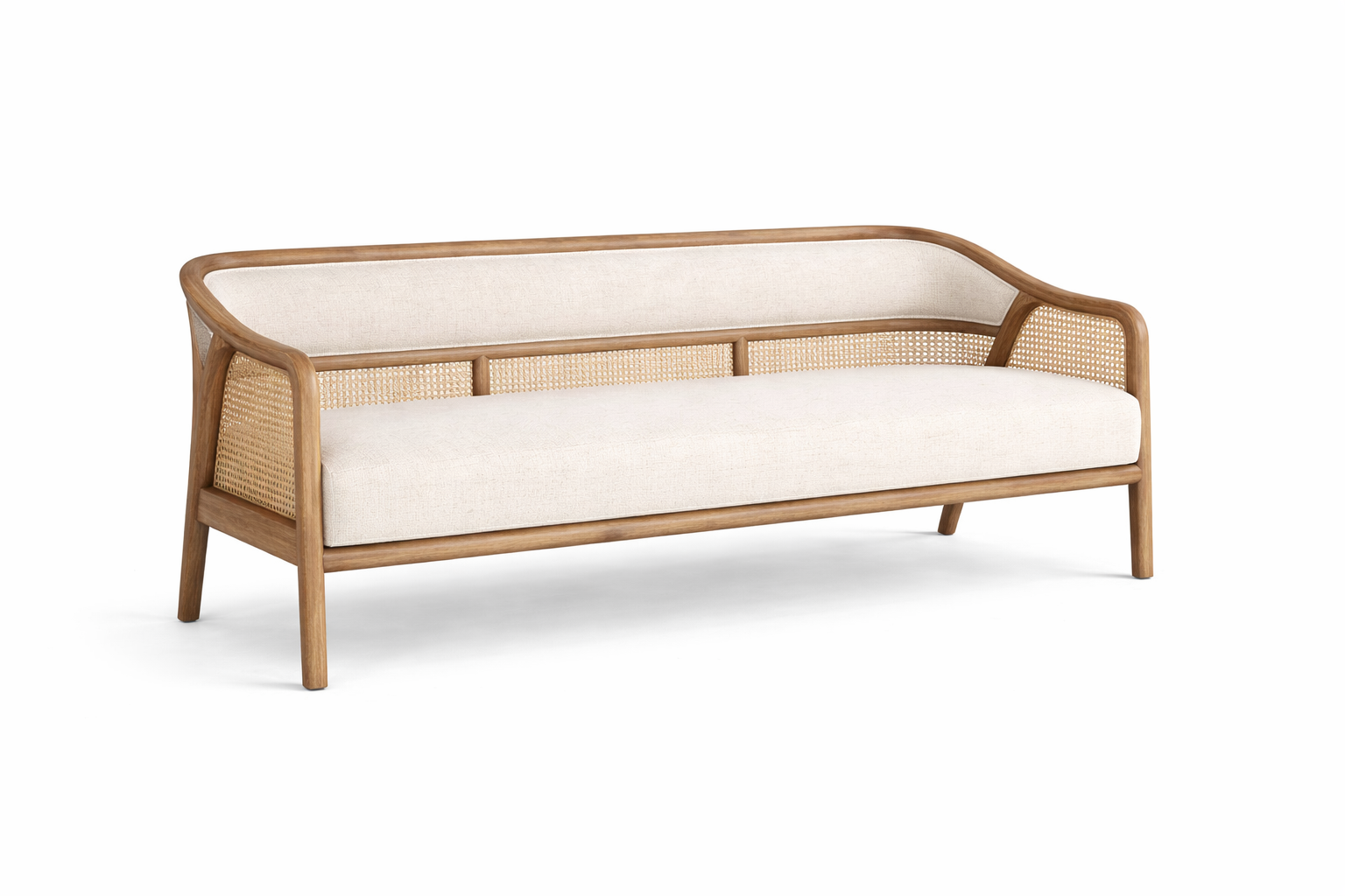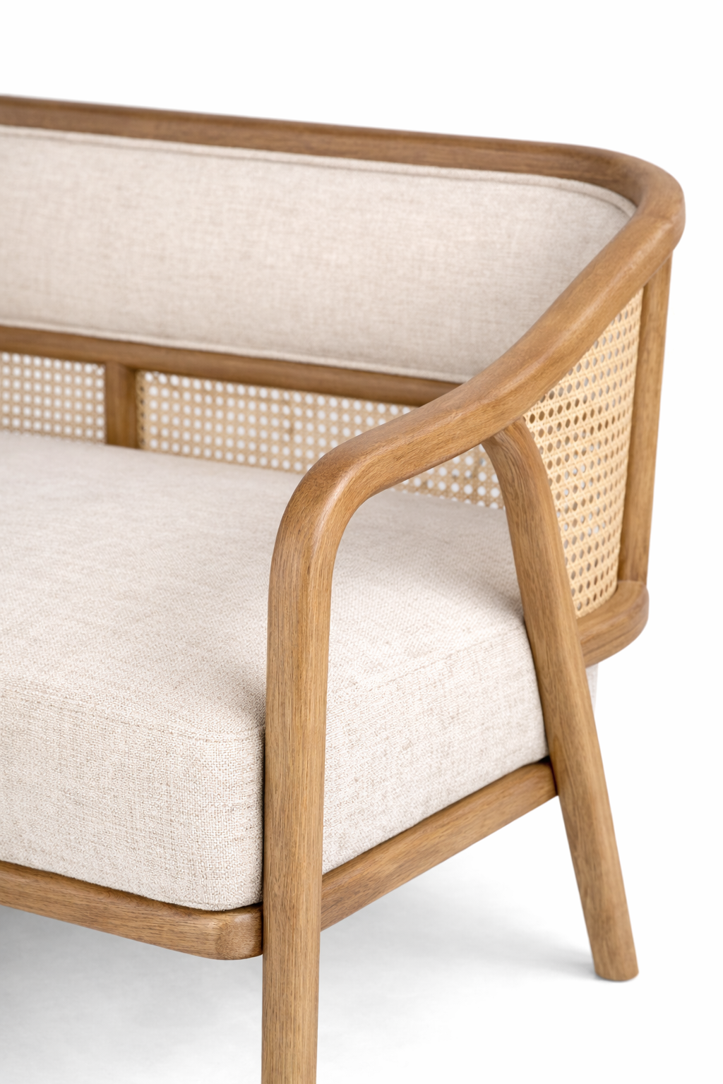 The woven cane panels introduce both elegance and craftsmanship, adding breathable texture and visual lightness to the sofas. Whether used on side frames, back panels, or arm sections, the cane detailing enhances the overall sophistication of the collection while reflecting traditional handwoven techniques adapted into contemporary forms.